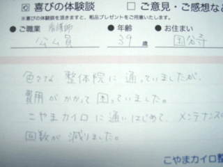 色々な整体院に通っていましたが費用がかかって困っていました。 こやまカイロに通い始めてメンテナンスの回数が減りました。 20年前に骨盤骨折、それから腰痛とあしのしびれに悩まされ色々な 治療院に通う。 痛みと痺れが酷くなり、3ヶ月間週3回、他の治療院通 院するも変わらず当院に。 |