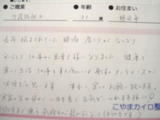 接骨院、整形外科をあちこち行きましたが痛みが取れず悩んでおりました。こやまカイロの1回の施術で体が楽になりました。希望を持ってずっと通いたい気持ちです。