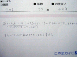 院長から ・・・ 書く事が仕事で手から来る肩や背中の痛み、猫背などを施術で変え身体の負担を減らしました。(H25年2月) |